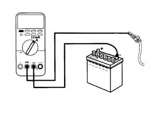 Проверить утечку тока аккумулятора можно обычным мультиметром, который есть у большинства людей в домашнем хозяйстве. Для проверки нужно снять одну клемму с аккумулятора и в получившийся разрыв цепи подсоединить мултиметр в режиме проверки тока. На мультиметре ставится диагностический режим A⎓ или DCA с пределом 10A или 20A. Красный щуп подсоединяется в разъем «10A», черный щуп — в «COM». Сами щупы подсоединяются один к аккумулятору, другой к снятой клемме. Если снимаете (+) значит к свободному контакту батареи подсоединяете красный щуп, а к снятой клемме черный щуп, если вдруг перепутаете щупы местами, то ничего страшного не будет, просто показатели будут с отметкой минус (−). Чтобы не было ошибочных показаний, измерения производятся с закрытыми дверями, выключенными приборами автомобиля и утопленным концевиком капота, так как капот будет открыт во время измерения, а также после 20 минут простоя автомобиля, так вся электроника уйдет в спящий режим.